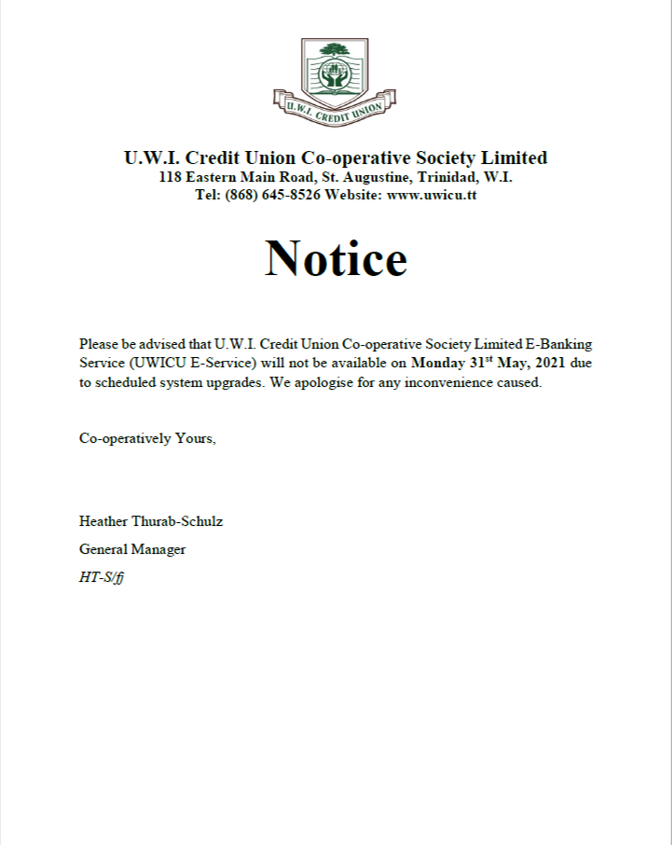 NOTICE OF UWICU E-SERVICE UNAVAILABILITY DUE TO SCHEDULED UPGRADE ON 31/05/2021