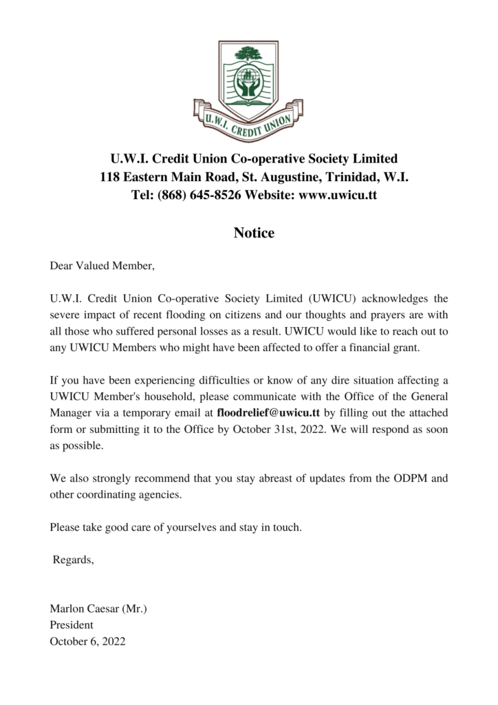 UWICU Members please click here to download UWICU Flood Relief Grant Application Form and then you may submit completed form to floodrelief@uwicu.tt