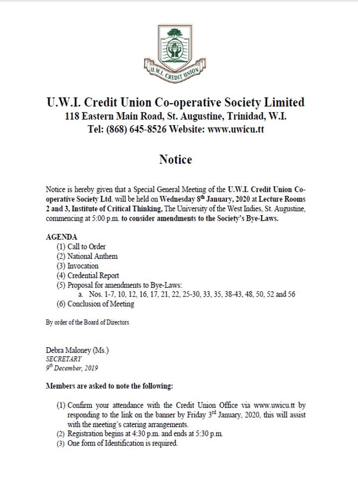 UWICU SPECIAL GENERAL MEETING NOTICE 2020