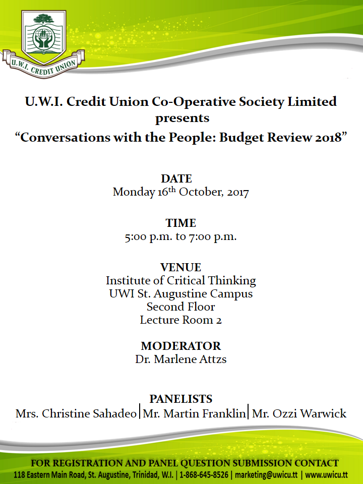 UWICU EVENT Conversations with the People: Budget Review 2018 DATE Monday 16th October, 2017 TIME 5:00 p.m. to 7:00 p.m. VENUE Institute of Critical Thinking UWI St. Augustine Campus, Second Floor, Lecture Room 2 MODERATOR Dr. Marlene Attzs PANELISTS Mrs. Christine Sahadeo Mr. Martin Franklin Mr. Ozzi Warwick For registration and panel question submission […]
