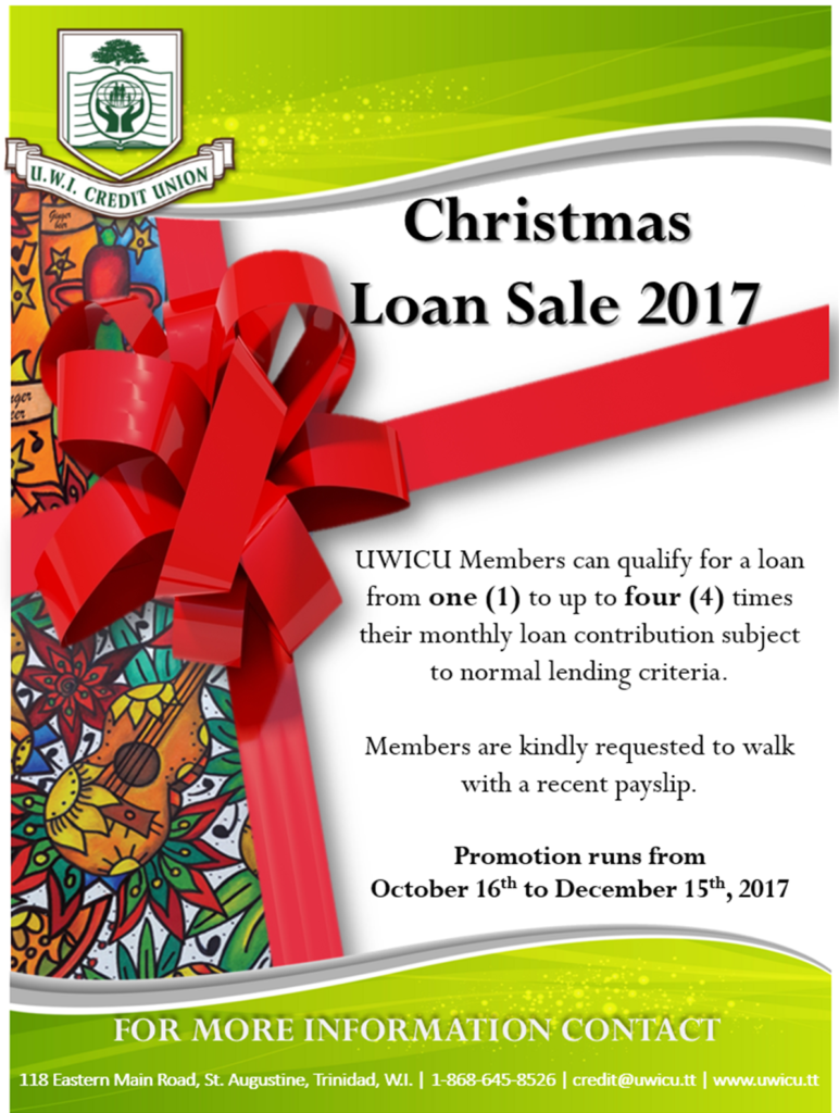 Christmas Loan Sale 2017 UWICU Members can qualify for a loan from one (1) to up to four (4) times their monthly loan contribution subject to normal lending criteria. Members are kindly requested to walk with a recent payslip. Promotion runs from October 16th to December 15th, 2017