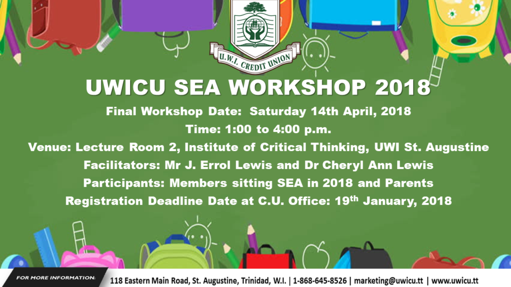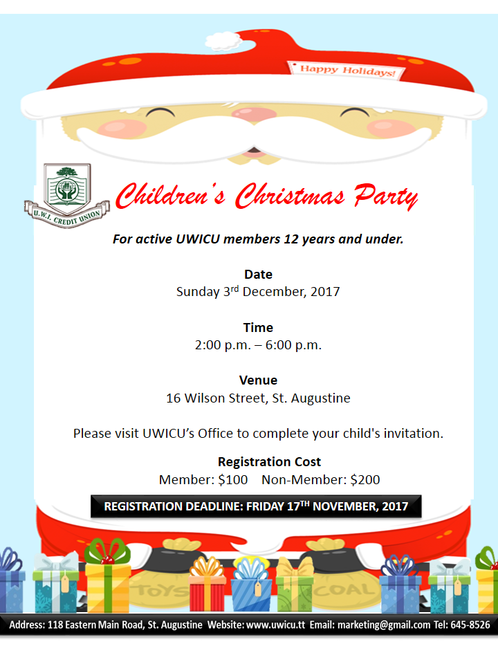 Event: Children’s Christmas Party 2017 Date: Sunday 3rd December, 2017 Time: 2:00 p.m. – 6:00 p.m. Venue: 16 Wilson Street, St. Augustine Registration Cost: Member: $100 Non-Member: $200 Registration Deadline: Friday 17th November, 2017 Please visit UWICU’s Office to complete your child’s invitation.