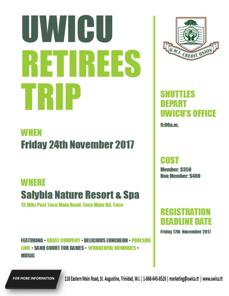 Event: UWICU Retirees’ Trip & Luncheon 2017 Date: Friday 24th November, 2017 Departure Time with Shuttle from UWICU Office: 9:00 a.m. Destination Venue: Salybia Nature Resort & Spa UWICU Member Cost: $350 Non-Member Cost: $400 Registration Deadline Date: Friday 17th November, 2017