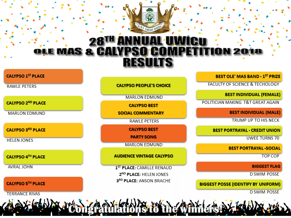 UWICU 28TH ANNUAL CALYPSO AND OLE MAS COMPETITION RESULTS
