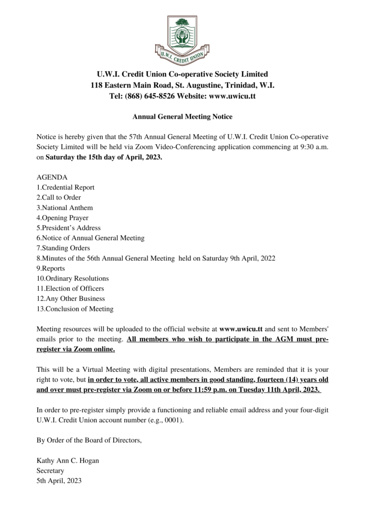 U.W.I. CREDIT UNION CO-OPERATIVE SOCIETY LIMITED 57TH ANNUAL GENERAL MEETING NOTICE
