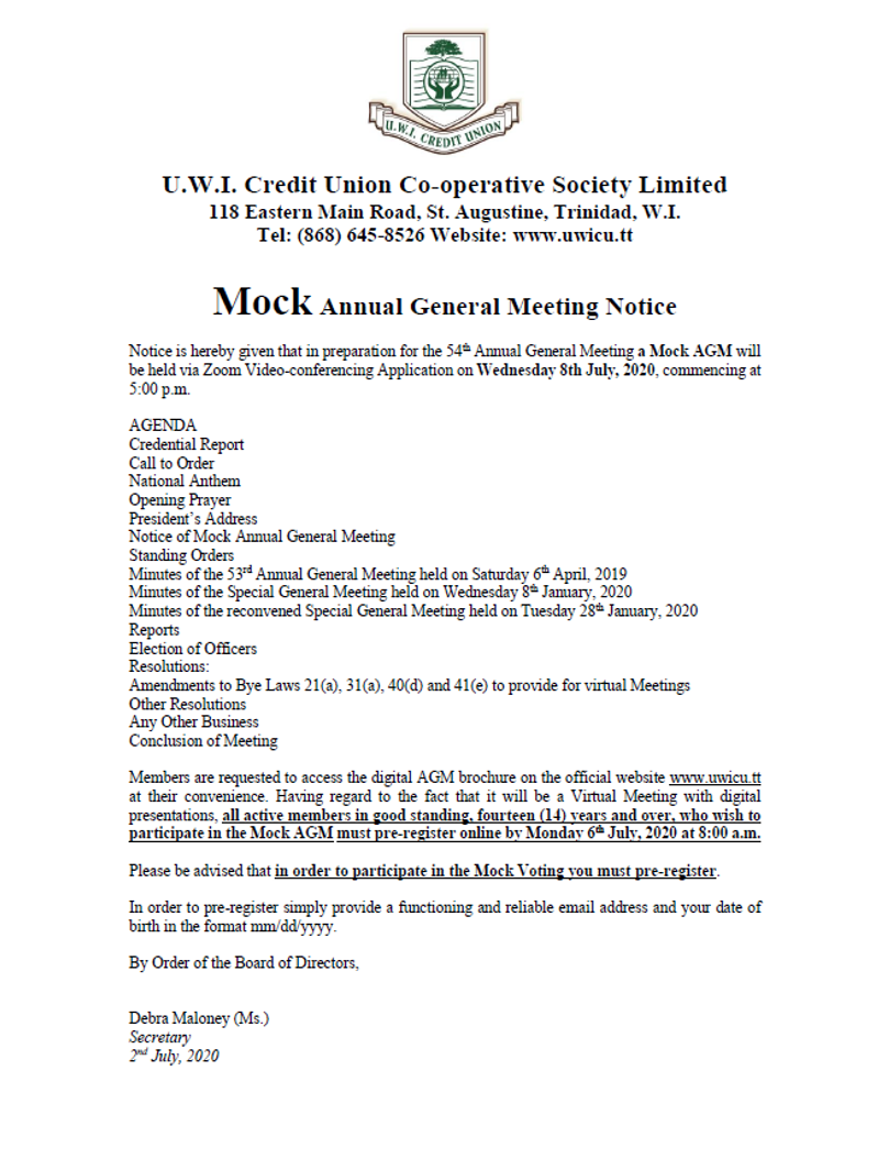 UWICU MOCK ANNUAL GENERAL MEETING NOTICE 2020