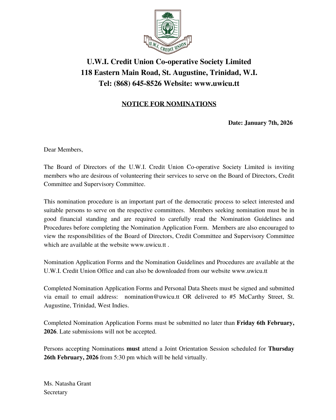 UWICU Notice for Nominations 2026